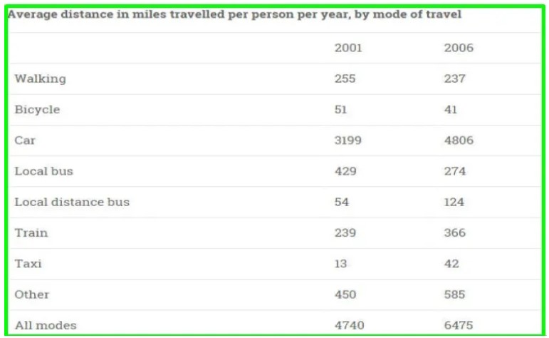 In 2001, the distance travelled by people in a car was 3199 miles, which increased sharply to 4806 miles in 2006, a rise of around 1600 miles. Although, individuals covered in a local bus is 429 miles which decreased drastically to 274 miles, whereas the distance covered in a train is 239 miles which rose significantly to 366 miles in the second year. Similarly, the second most preferred transportation is other that accounted at 450 miles, which show a significant rise to 585 miles. Another way of covering the distance is through walking; it accounted for 255 miles. It shows a slight fall to 237 miles.