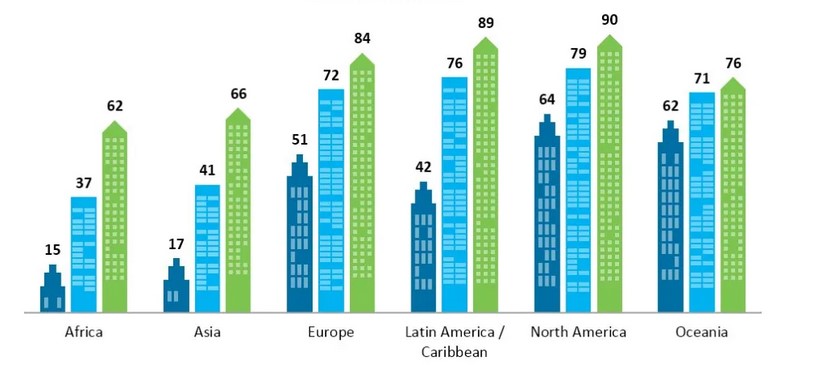 The bar chart below gives information about the percentage of the population living in urban areas in different parts of the world. Summarise the information by selecting and reporting the main features, and make comparisons where relevant.