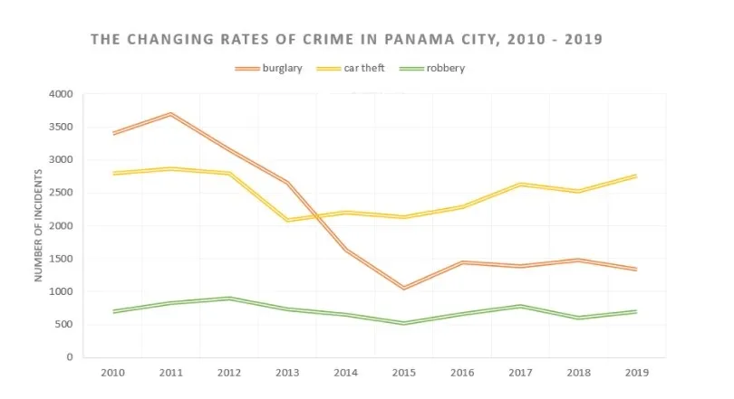 The chart below shows the changes that took place in three different areas of crime in Panama City from 2010 to 2019. Summarise the information by selecting and reporting the main features, and make comparisons where relevant.