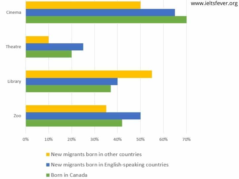 Lastly, New migrants who born in other countries, unlike others they visited library most nearly 55% and very few of them visited theatre only 10%, however, they visited cinema and zoo around 50% and 35% respectively.