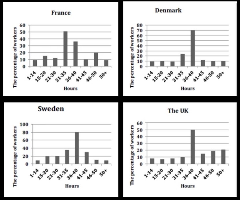 An in-depth analysis of the bar graphs reveals that, in France, approximately, ha;f the workers work for 31 -35 and 36-40 hours, 50% and 38% respectively. Only 20% of workers are worked in 4650 hours. Other working hours are accounted for around 12%, and fewer workers each Denmark, Sweden and the UK witnessed the highest proportion of people working fr 36-40 hours, which was quite different from France. The second and third highest proportion for (31-35 and 41-45)Denmark and Sweden. Comparatively, Sweden’s little increase showed in the number of the hours who spent the time of workers almost 10%.