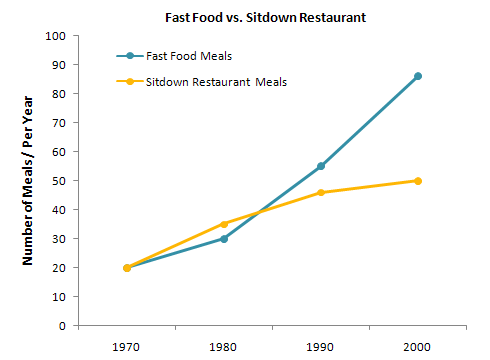 In the case of sit down restaurant meals, the trend was started with 20 meals per year, and it exacerbated in successive years. By the year 2000, sit down restaurant meals were held at a difference of nearly 30 meals per year.