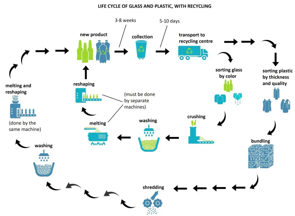 Overall, both plastic and glass undergo a series of stages, beginning from the collection point of both items as well as culminating in reshaping the plastic and glass with the aid of a machine and assembling the new products.