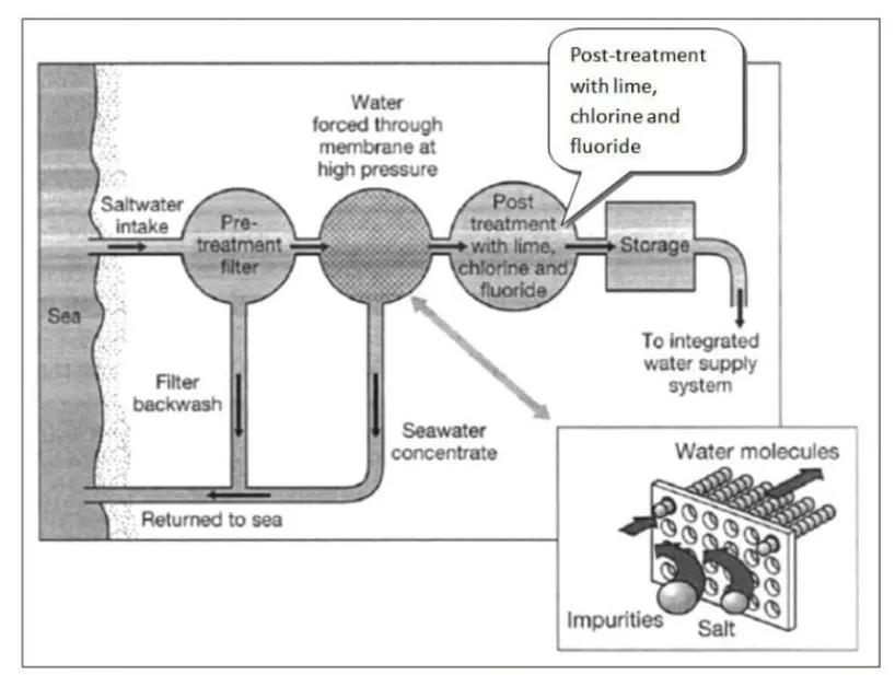 From the reservoir to the integrated water supply system, then finally impurities, salt, and water molecules are separated.
