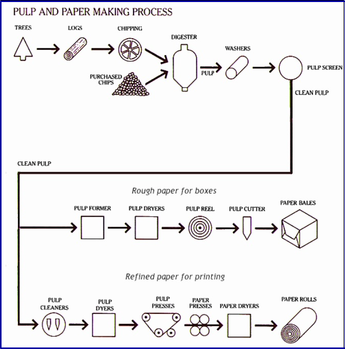 The diagram gives information about the process of making pulp and paper. Summarize the information by selecting and reporting the main features, and make comparisons where relevant. You should write at least 150 words.