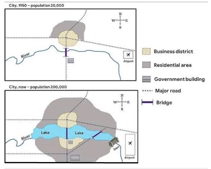 The Map of a City in 1950 and now. Summarise the information by selecting and reporting the main features, and make comparisons where relevant.