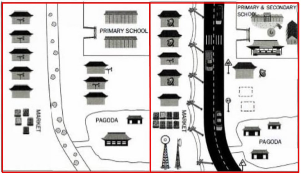 The maps below show Pancha Village in 2005 and 2015. Summarise the information by selecting and reporting the main features, and make comparisons where relevant.