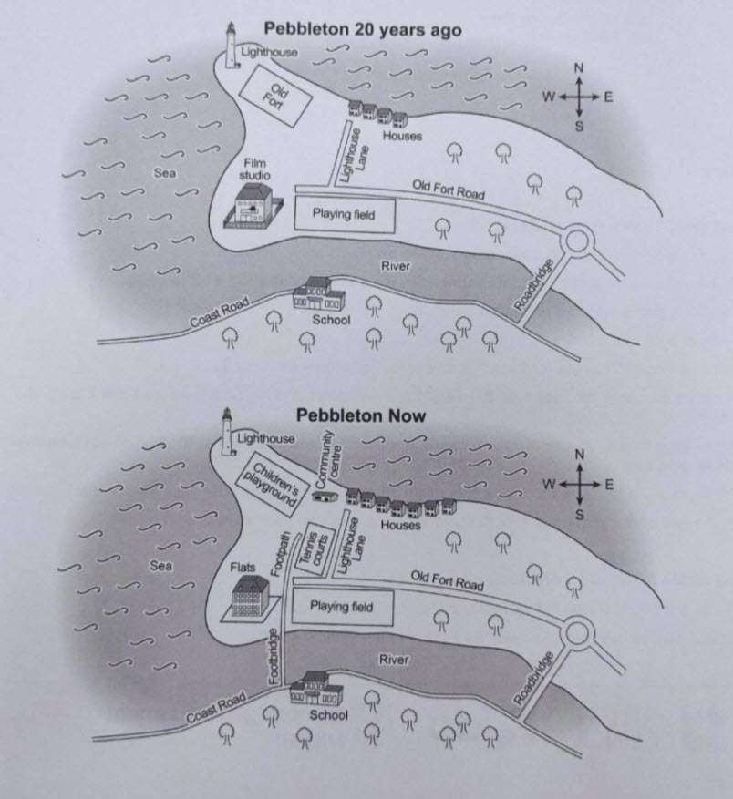 The maps below show Pebbleton 20 years ago and today. Summarise the information by selecting and reporting the main features, and make comparisons where relevant.