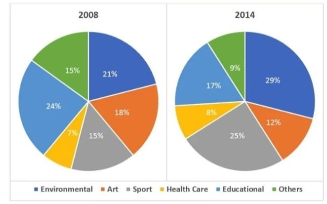 From a quick glance at the pie chart, it is clearly seen that there were changes in volunteers from 2008 to 2014. In 2008, the environmental voluntary proportion was 21%; however, in 2014, it was increased by 8% that is 29%. The second type was 8 as it was more in 2008 that is 18% and in 2014 it was only 12 %. Type is sports as there was an aspectual increase from 2008 to 2014 of 10% that is 15% and 25% respectively. After that, Health Care is another category of volunteer, and in this, there was not such a dramatic change as it was 7% in 2008 and only 1% was increased in 2014. Another class is educational as there was a decline AAP 7% from 2008(24%) to 2014(17%). The last type is others who were 15 people in 2008 and 9% in 2014.