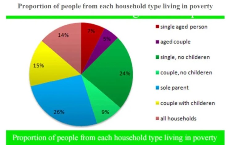 Having a quick glance over the chart, it is seen that a total of seven different families is given. The sole parents suffer maximum from poverty, and the proportion was 26%. However, the aged couple suffers a minimum from it (9%).