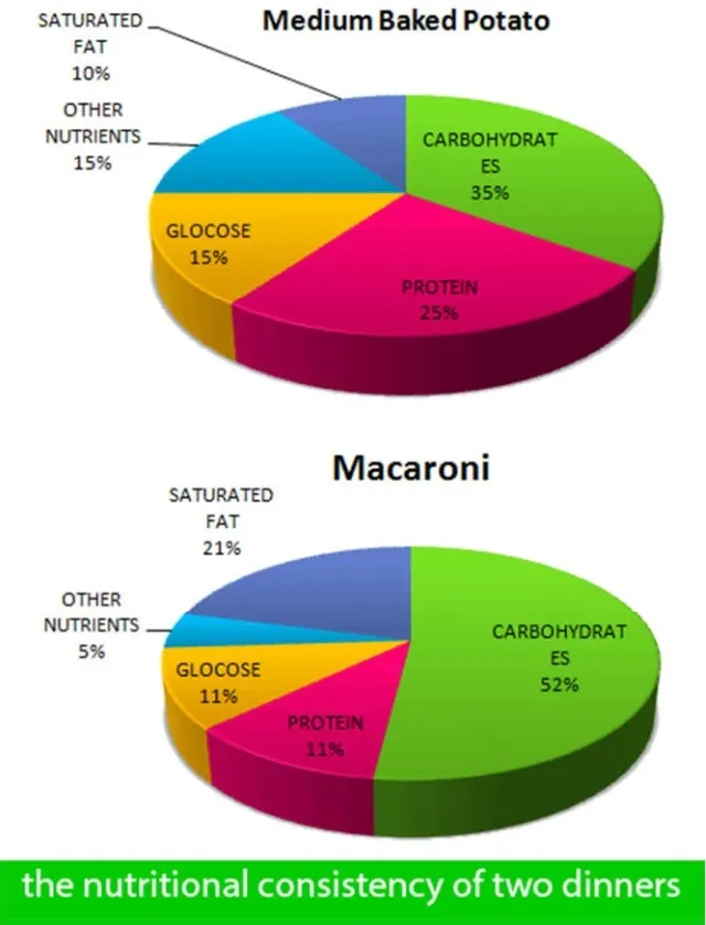 The given pie charts demonstrate two different dinners, medium baked potato and macaroni nutritional consistency.