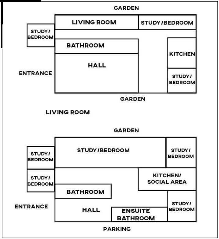 Moreover, there will be 5 study rooms in the future home. After the entrance, there will be a hall which is medium in size and a bathroom also. The Ensuite bathroom will also be added next to the hall. After that, the area will be covered with study bedrooms as well as a kitchen and social area. Next to it, there will be a small as well as a big study room. On the left side, there will also be two study bedrooms and with one garden on the top as another one will be replaced with a parking area.
