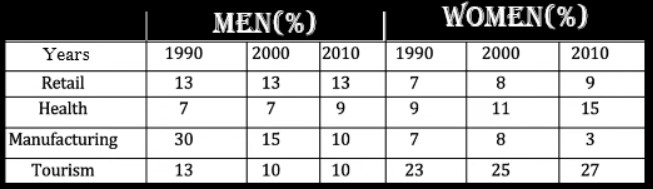 Moving forward, a large number of females proficient in tourism in 1990, 2000 and 2010, at around 23%, 25% and 27% correspondingly. Moreover, slight growth was noted in the health expertise of females, from 9 % to 15%, between 1990 and 2010. Besides this, in the retail and manufacturing sectors, they were similarly expert in 1990 and 2000, at appropriately 7% and 8%, respectively. In the last year, women proficiency in retail were doubled than in manufacturing.
